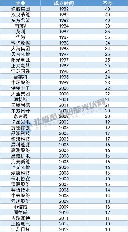 光伏企業(yè)是推動光伏產業(yè)不斷向前的主力軍,而企業(yè)的市場布局、技術發(fā)展、產品品質、穩(wěn)健經營等共同培育著企業(yè)的生命力。據北極星太陽能光伏網不完全統(tǒng)計,成立至今年限超過10年以上的光伏企業(yè)(含光伏企業(yè))高達數(shù)十家,成立至今40年的有通威、東方希望及雙良節(jié)能;華為、科華、英利等成立超30年;天合、陽光電源、正泰、特變電工、東方日升、江蘇國強等12家企業(yè)成立時間在20年及以上。